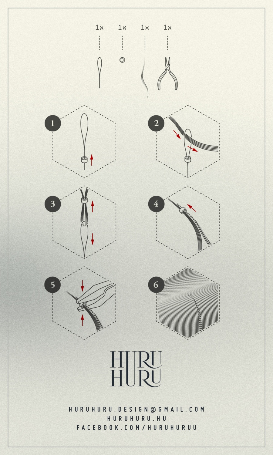 A rögzítés hajhosszabbításhoz használt szilikon gyűrűvel történik. A csomag két alkalomra elegendő gyűrűt, valamint hurkoló segédeszközt tartalmaz. (A csőrös fogó / ékszerfogó nem része a csomagnak.)