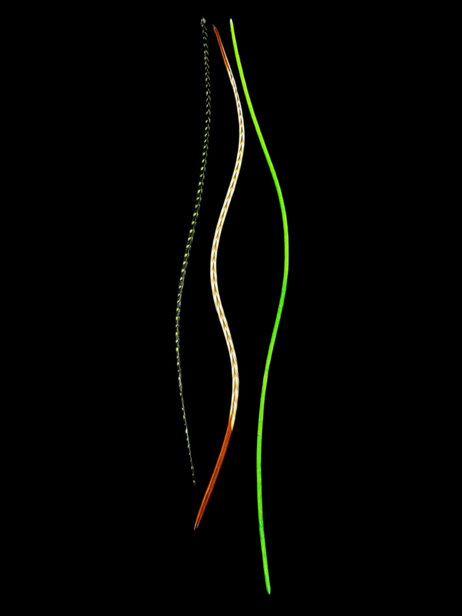Az aktuális összeállítás kézzel festett neon és fű zöld és natúr vöröses halvány csíkos tollakból áll.