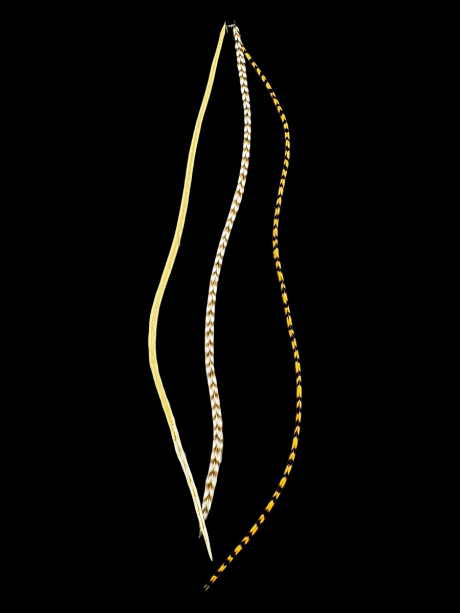 Az aktuális összeállítás natúr barna-fehér csíkos, homokbarna és festett sárga tollakból áll.