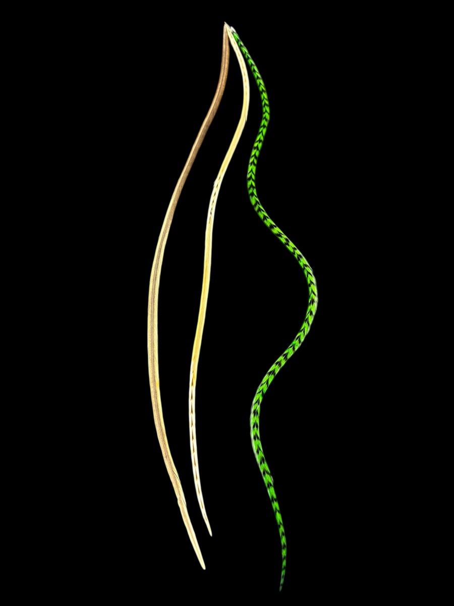 Az aktuális összeállítás natúr homok barna halvány csíkos és kézzel festett zöld tollakból áll.