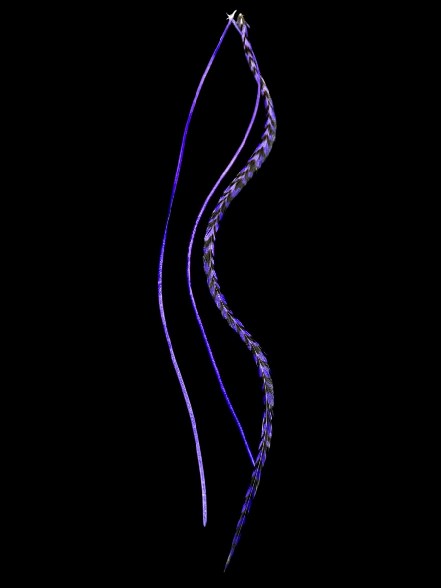Az aktuális összeállítás kézzel festett lila tollakból áll.