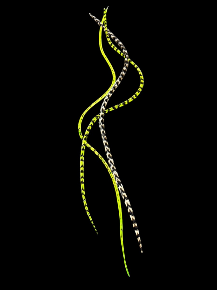 Az aktuális összeállítás kézzel festett csíkos neonzöld és natúr fekete-fehér csíkos tollakból áll.