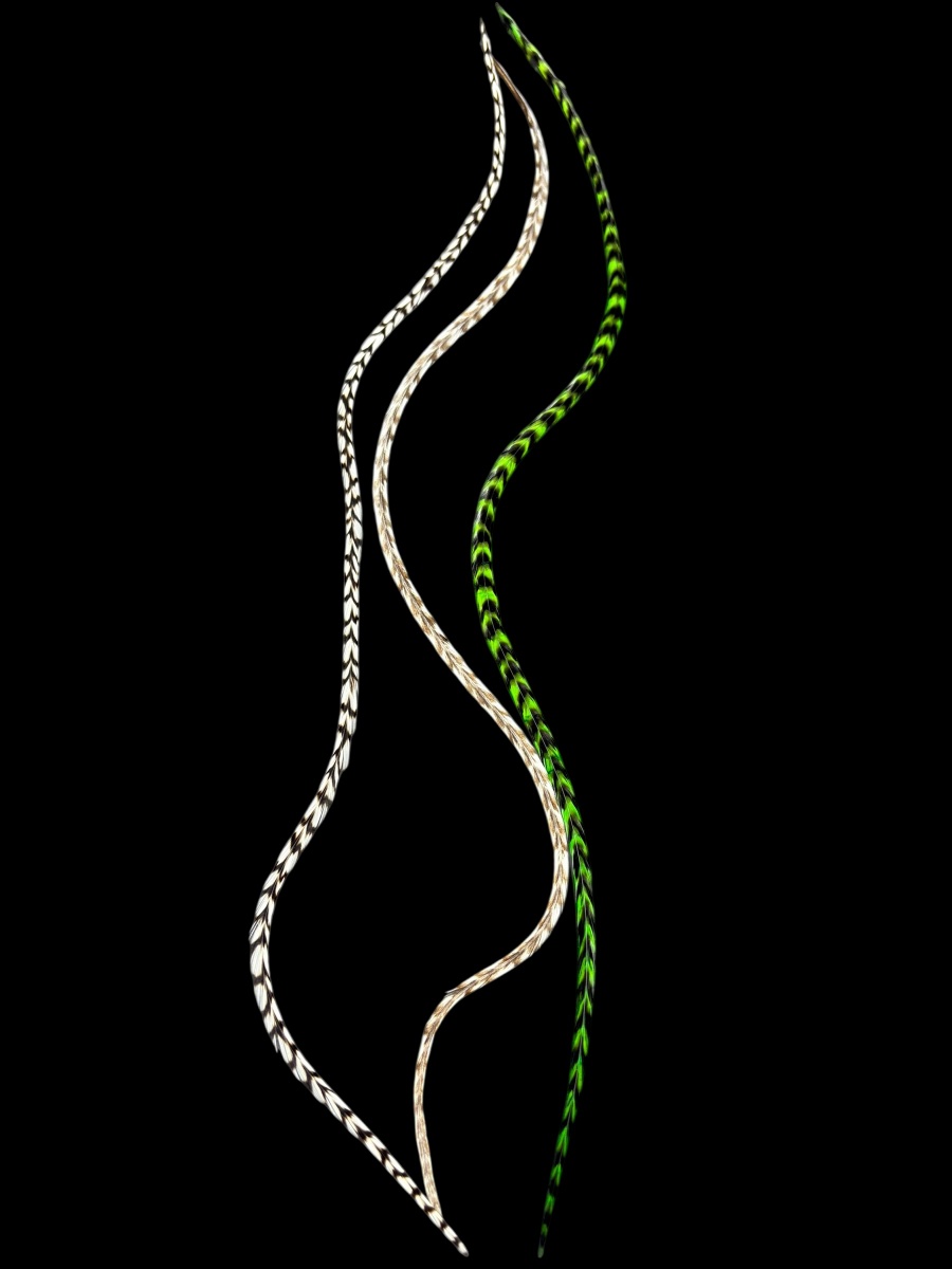 Az aktuális összeállítás kézzel festett zöld csíkos és natúr barna- és fekete-fehér csíkos tollakból áll.