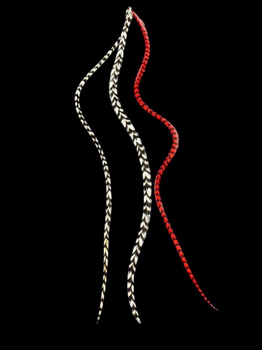 Az aktuális összeállítás natúr fekete-fehér csíkos és kézzel festett piros csíkos tollakból áll.