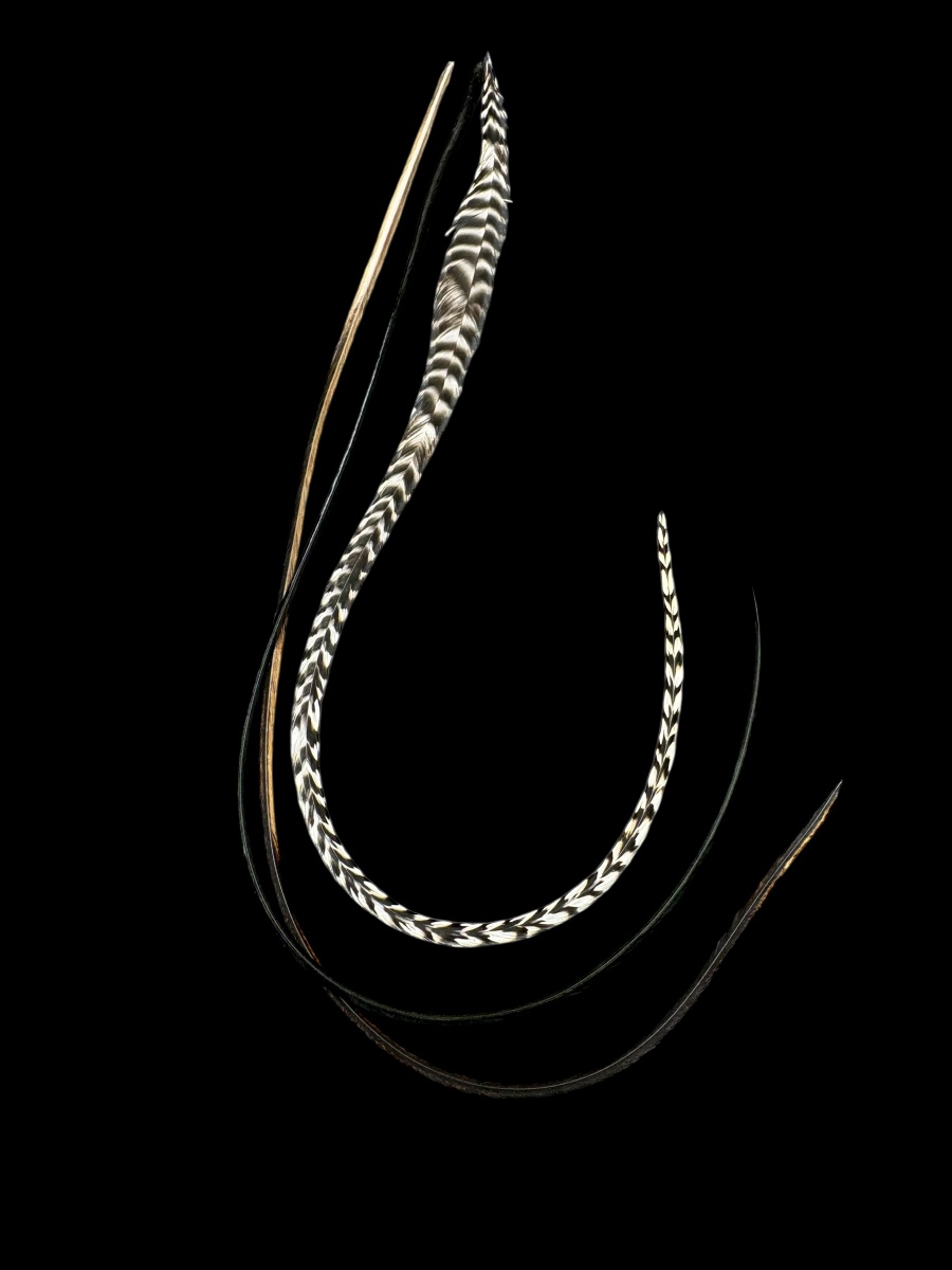 Az aktuális összeállítás natúr fekete-fehér csíkos, irizáló fekete, foltos barnás fekete tollakból áll.
